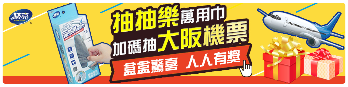 凡購買【啵亮_抽抽樂萬用巾12入】商品且完成『盒盒驚喜人人有獎』兌獎程序之消費者,於活動期間內即享有二次參加『大阪機票加碼抽』免費抽獎資格.