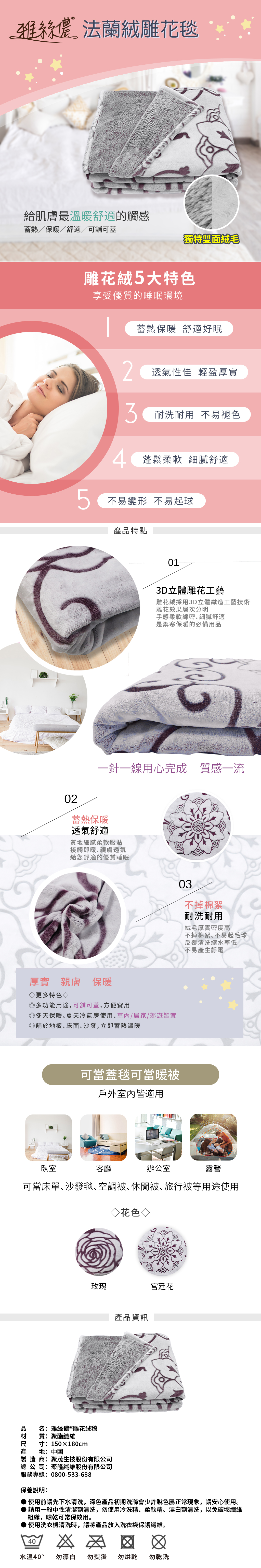 獨特雙面絨毛,立體雕花圖樣